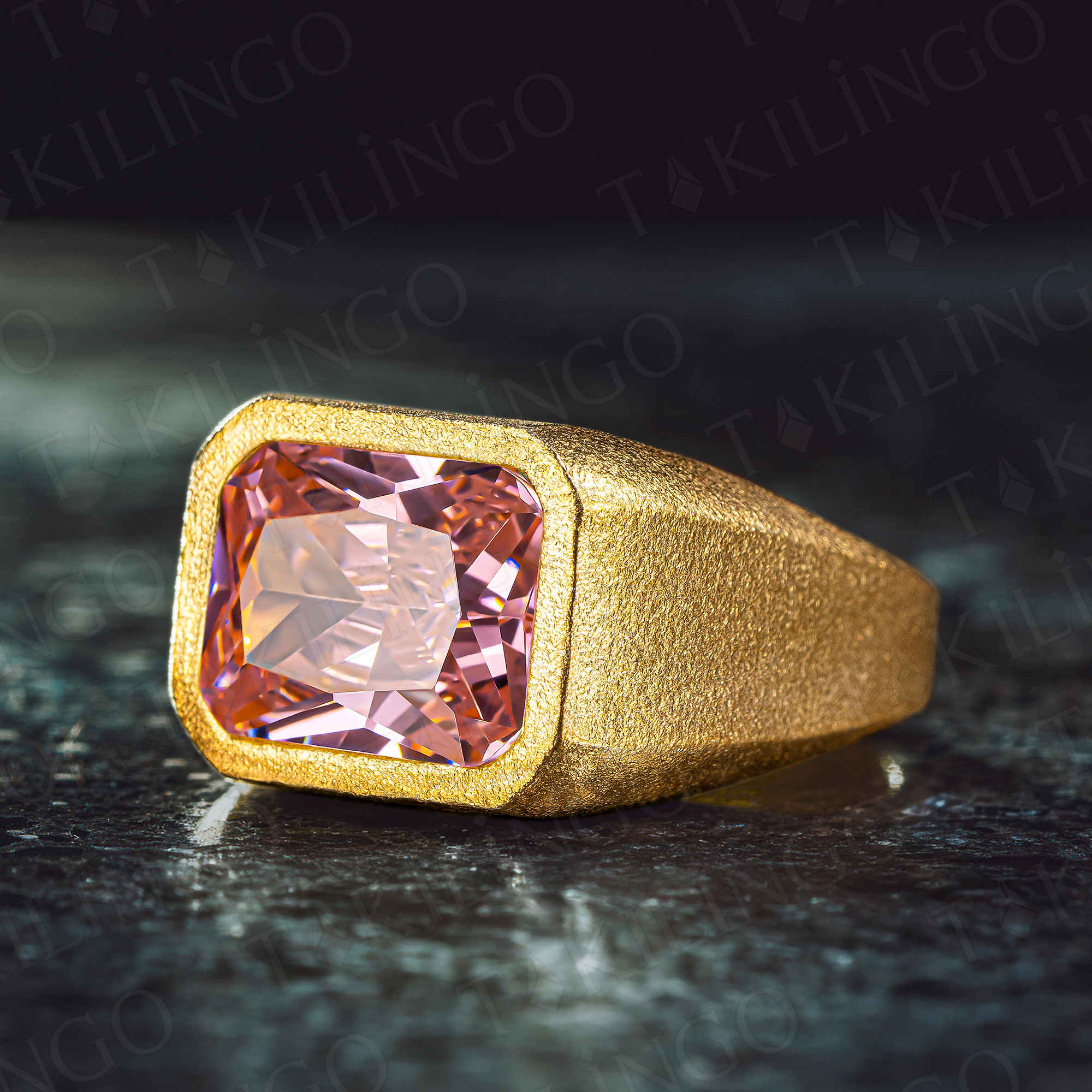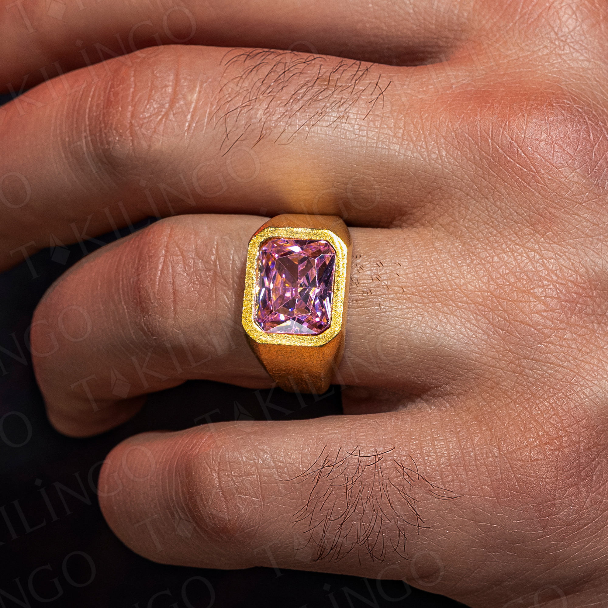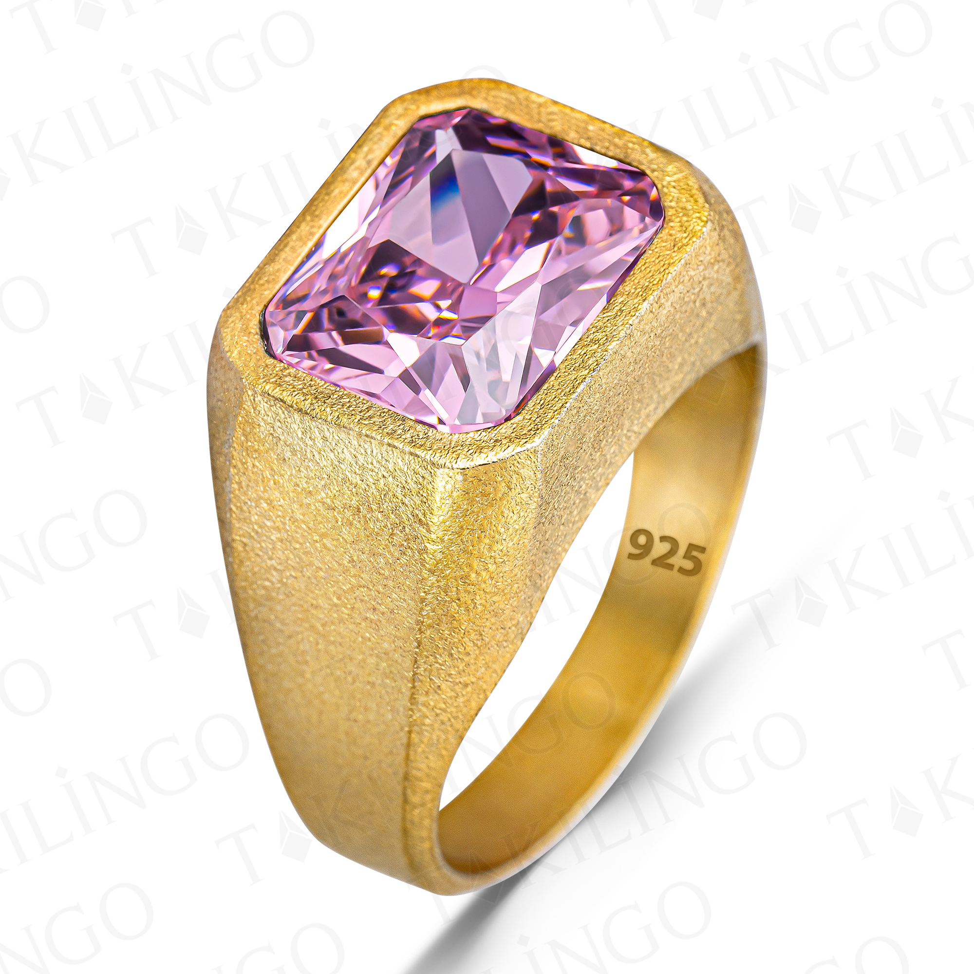 925 Ayar Gümüş Altın Kaplama Pembe Zirkon Taşlı Sade Erkek Yüzük