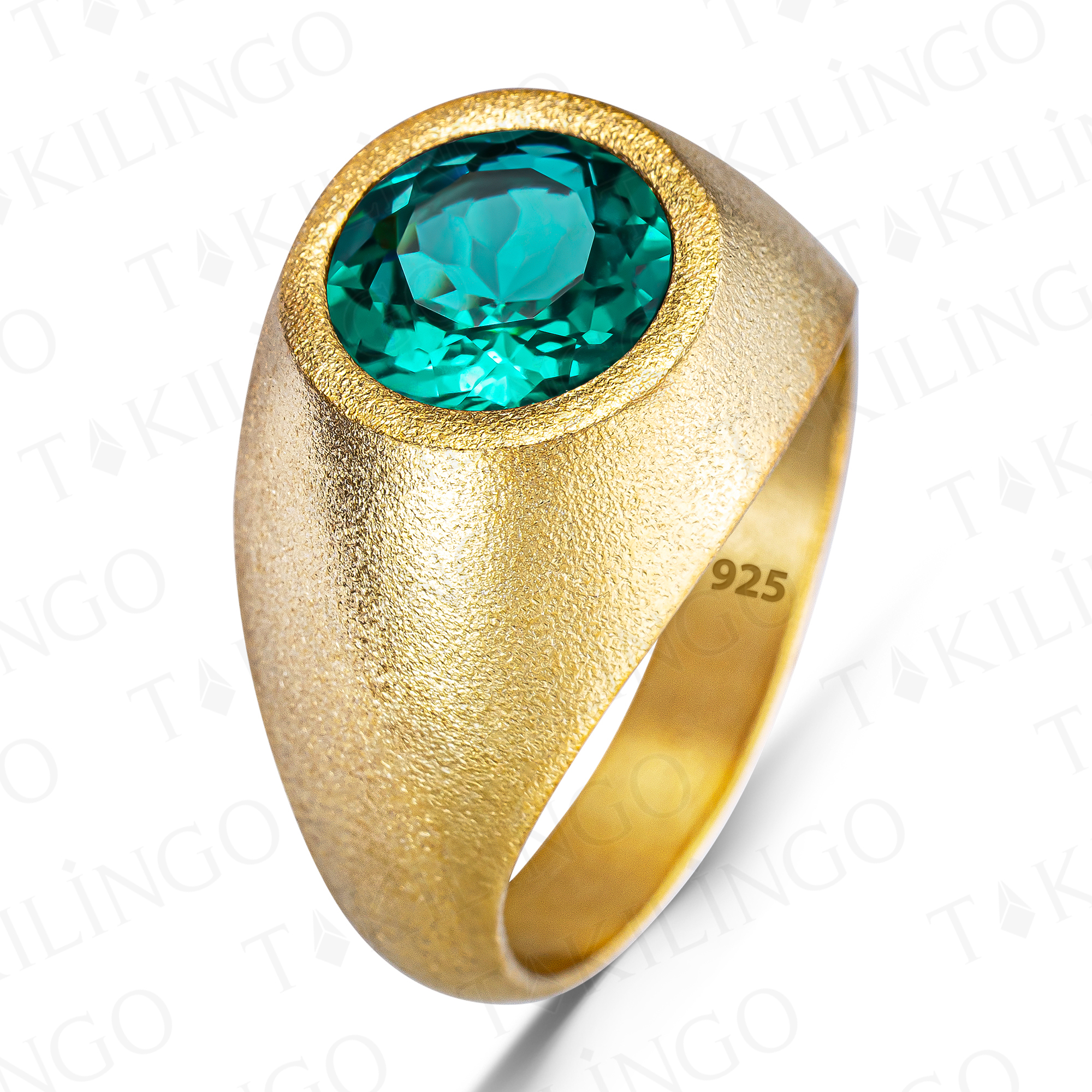 925 Ayar Gümüş Altın Kaplama Yuvarlak Deniz Mavisi Zirkon Taşlı Erkek Yüzük