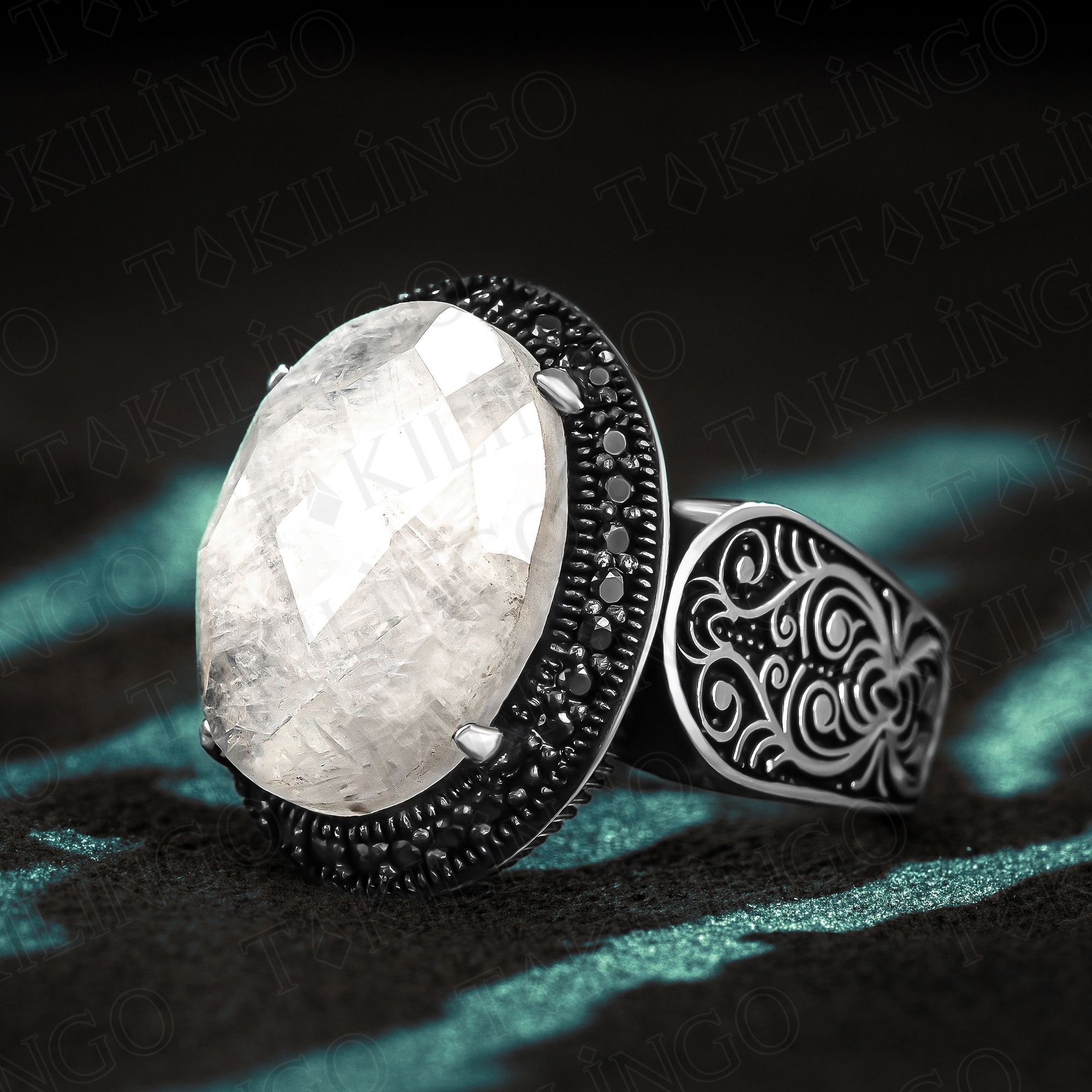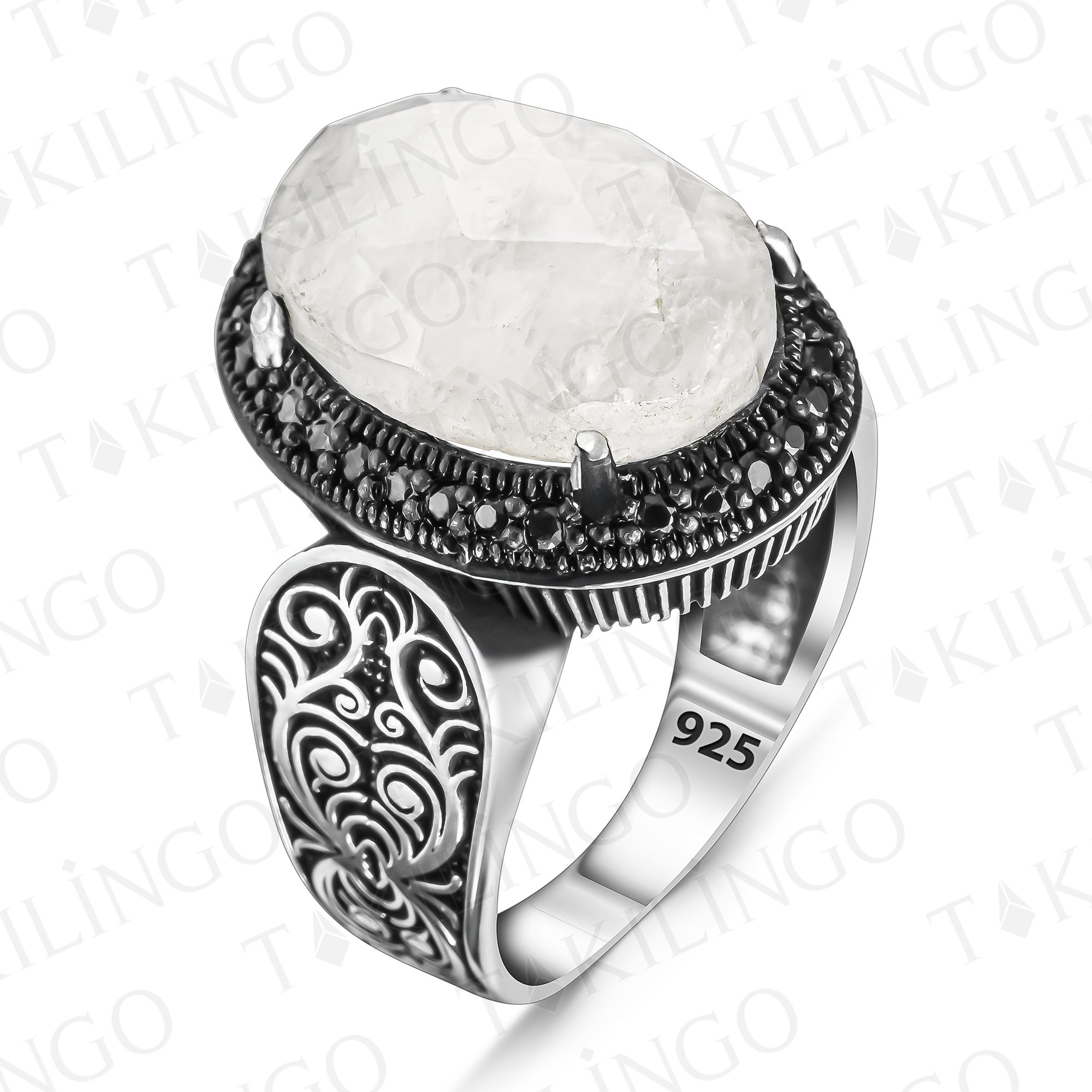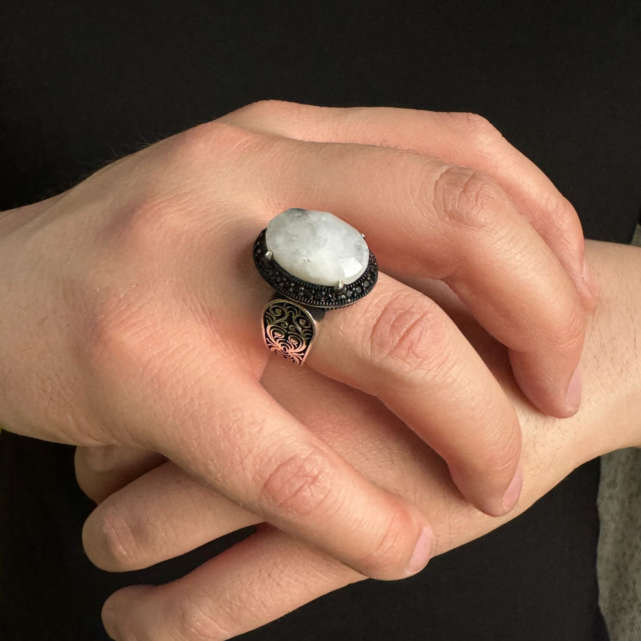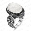 925 Ayar Gümüş Beyaz Ay Taşı İşlemeli Usta İşi Erkek Yüzük
