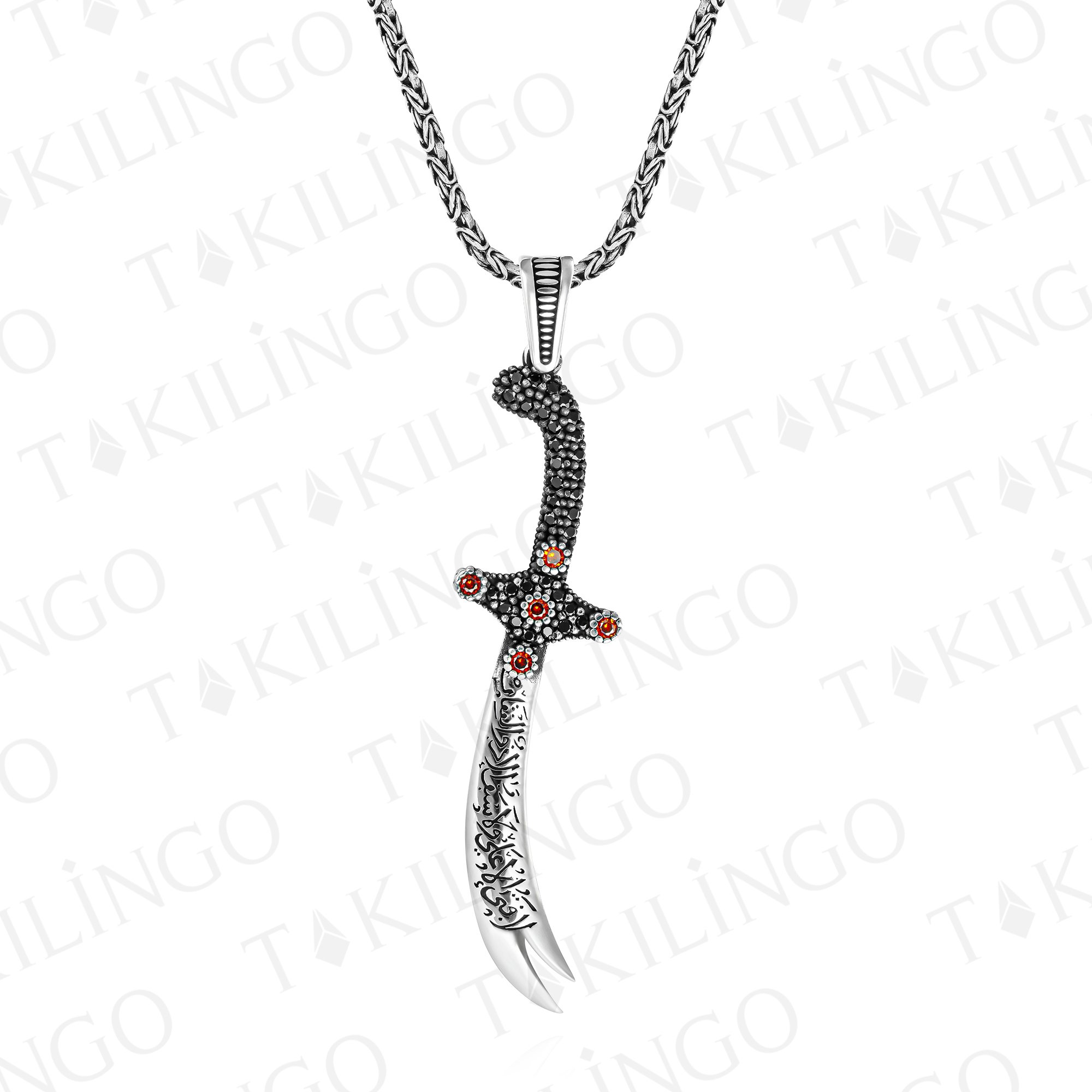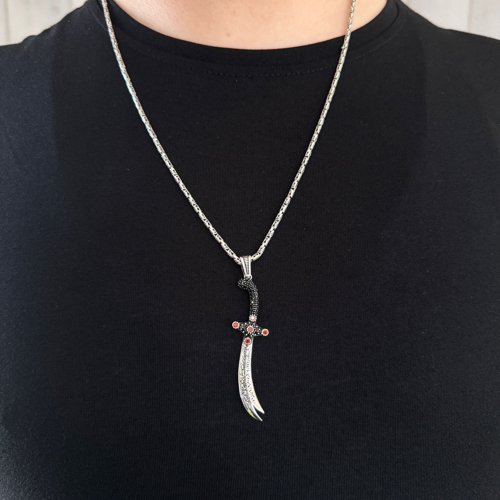 925 Ayar Gümüş Hz Ali Zülfikar Kılıç Motifli Yazılı 2 mm Kral Zincir Erkek Kolye