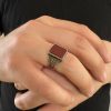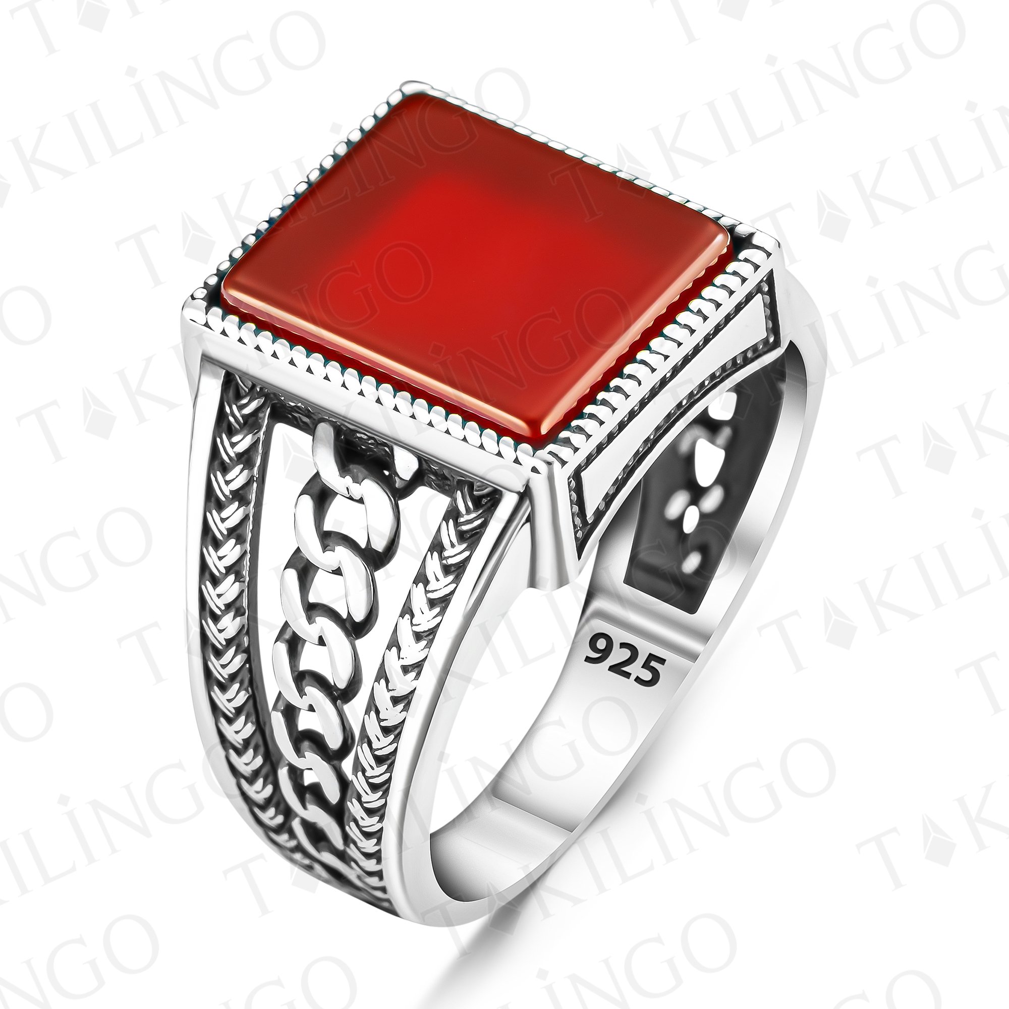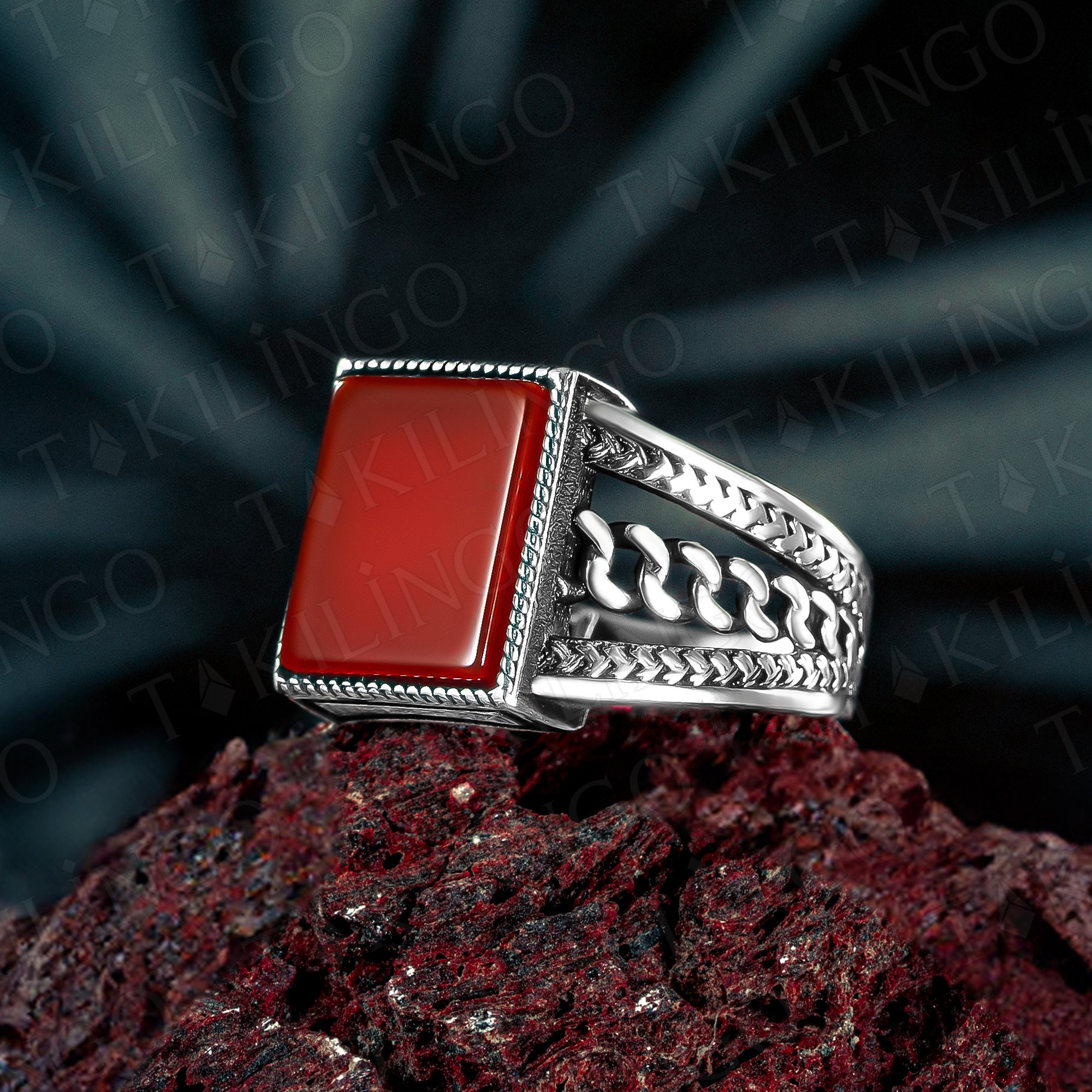 925 Ayar Gümüş Kırmızı Akik Taşlı Sade Zincir Desenli Erkek Yüzük