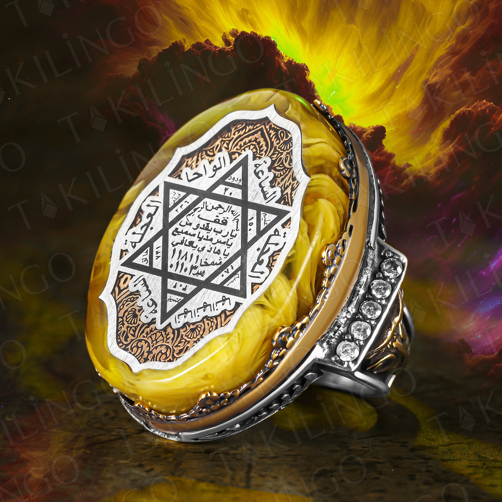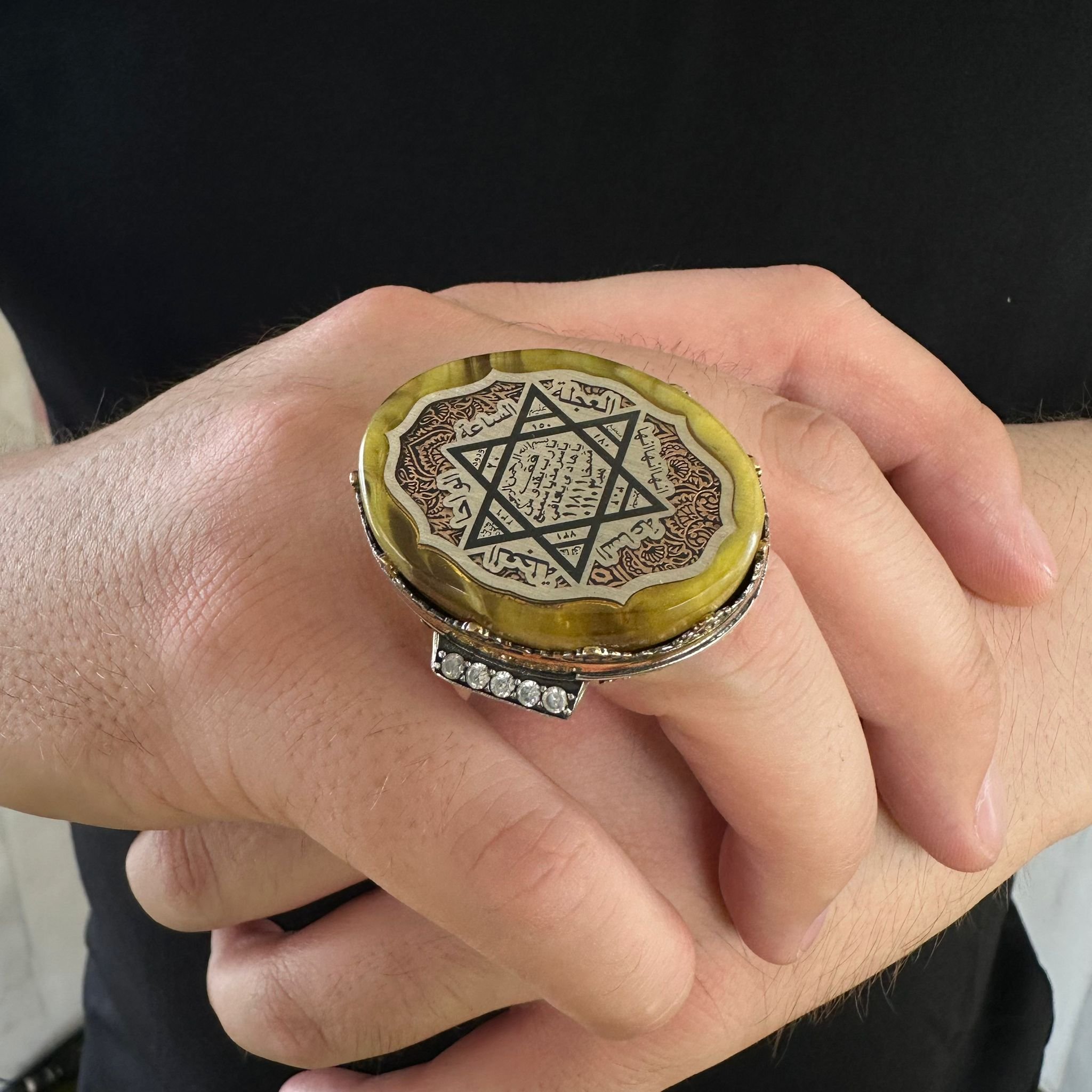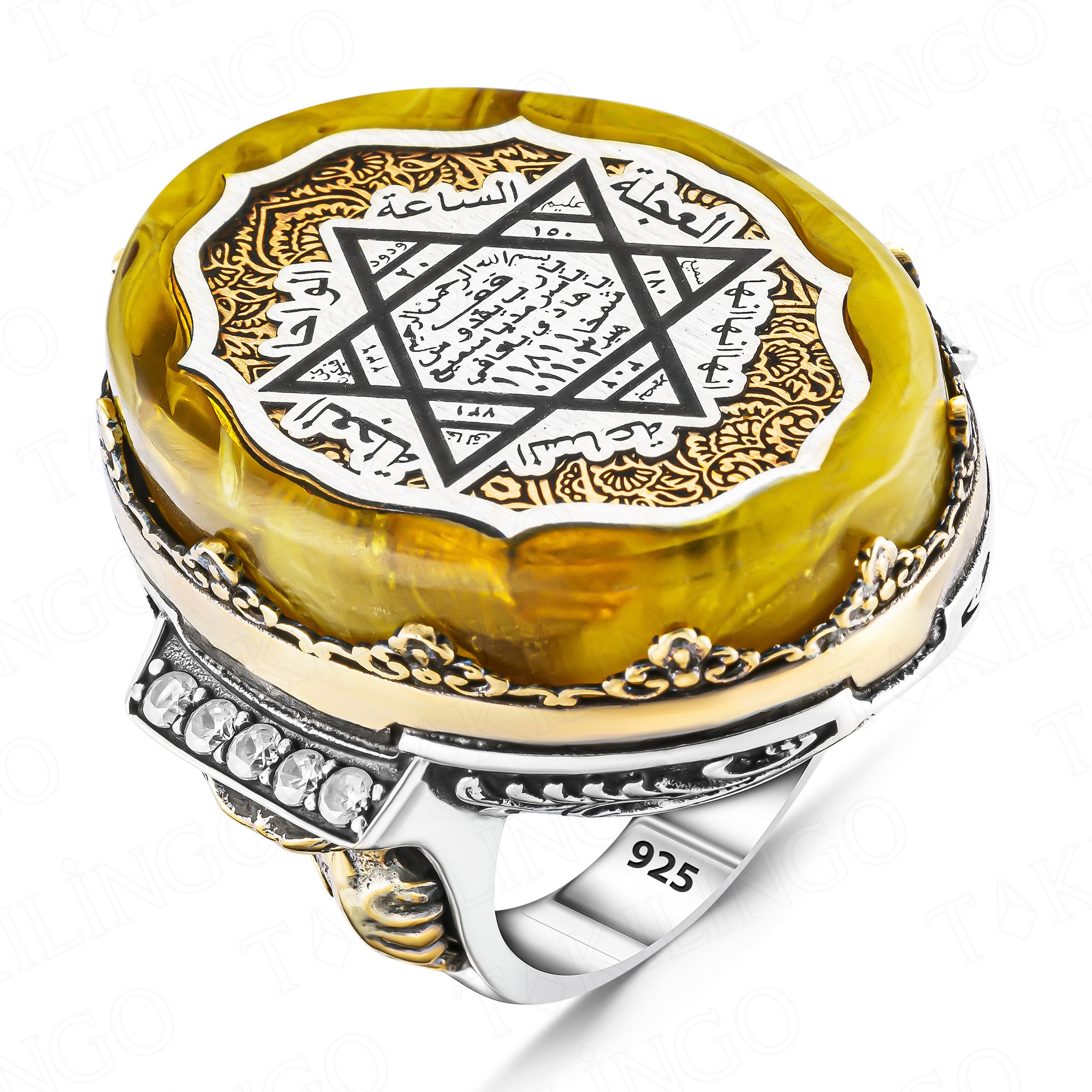 925 Ayar Gümüş Koleksiyonluk Büyük Kasa Kehribar Taşlı Süleyman Mührü Model Usta İşi Erkek Yüzük