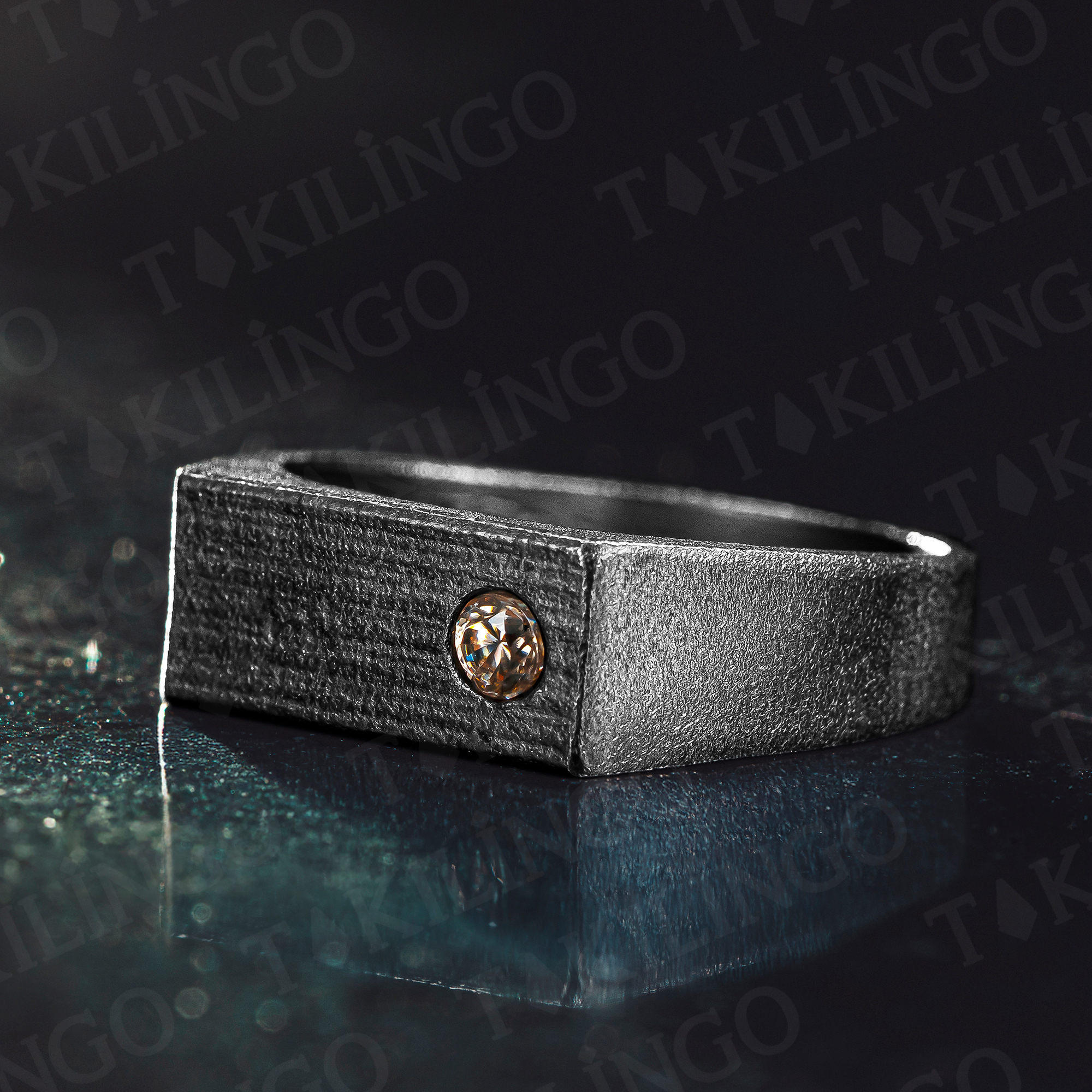 925 Ayar Gümüş Oksitli Şampanya Zirkon Taşlı Sade Erkek Yüzük