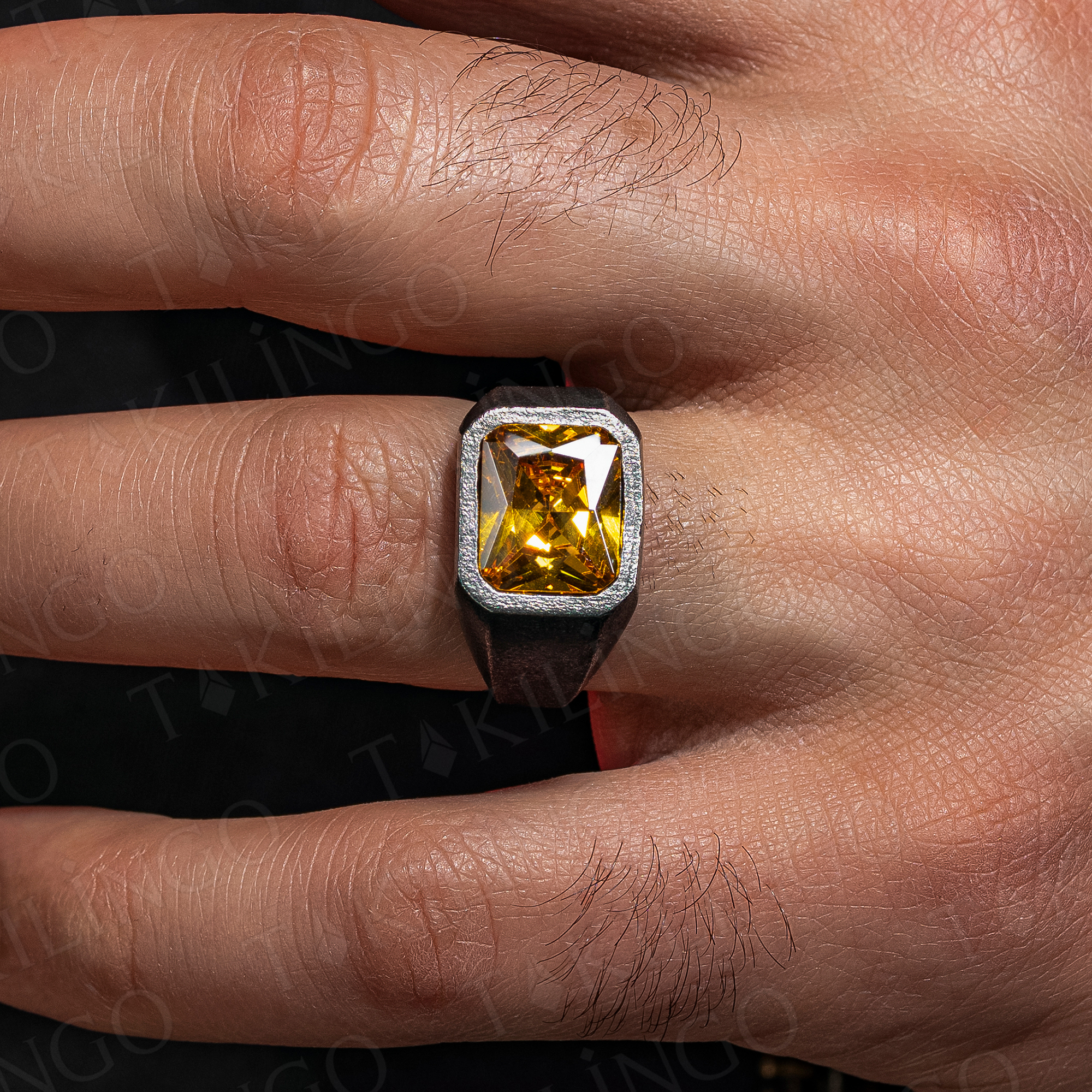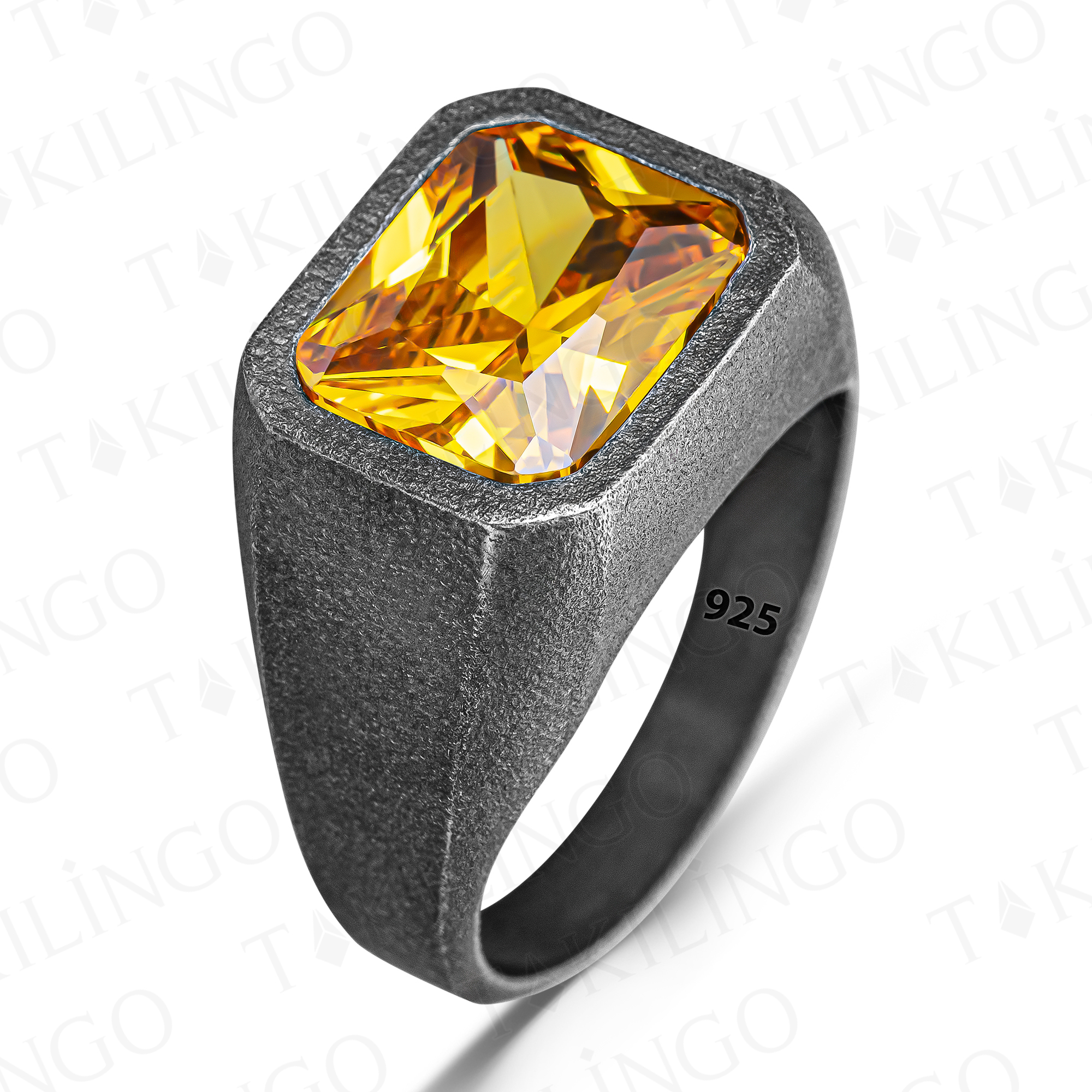 925 Ayar Gümüş Oksitli Sarı Sitrin Taşlı Sade Erkek Yüzük