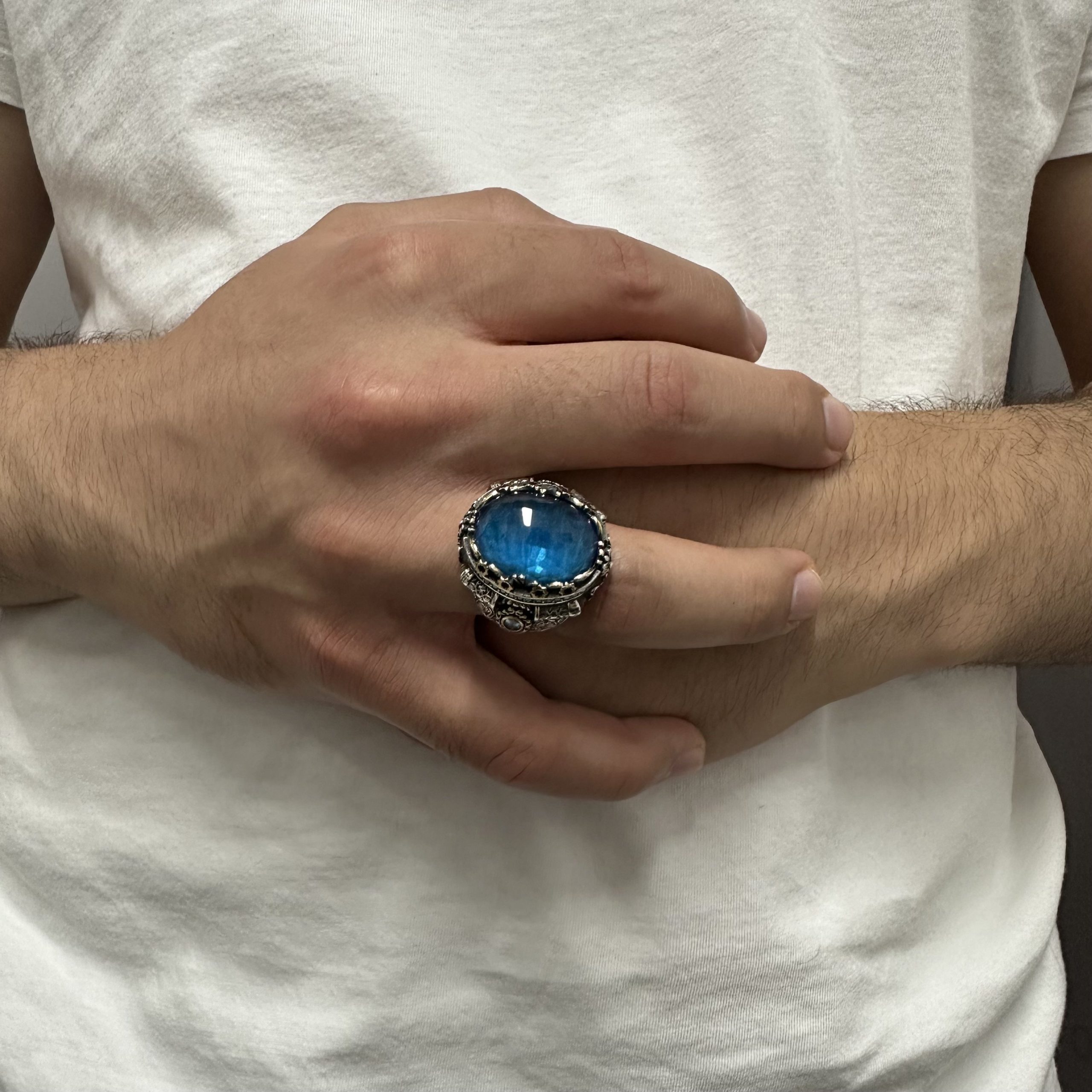 925 Ayar Gümüş Oval Akuamarin Taşlı Usta İşi Erkek Yüzük