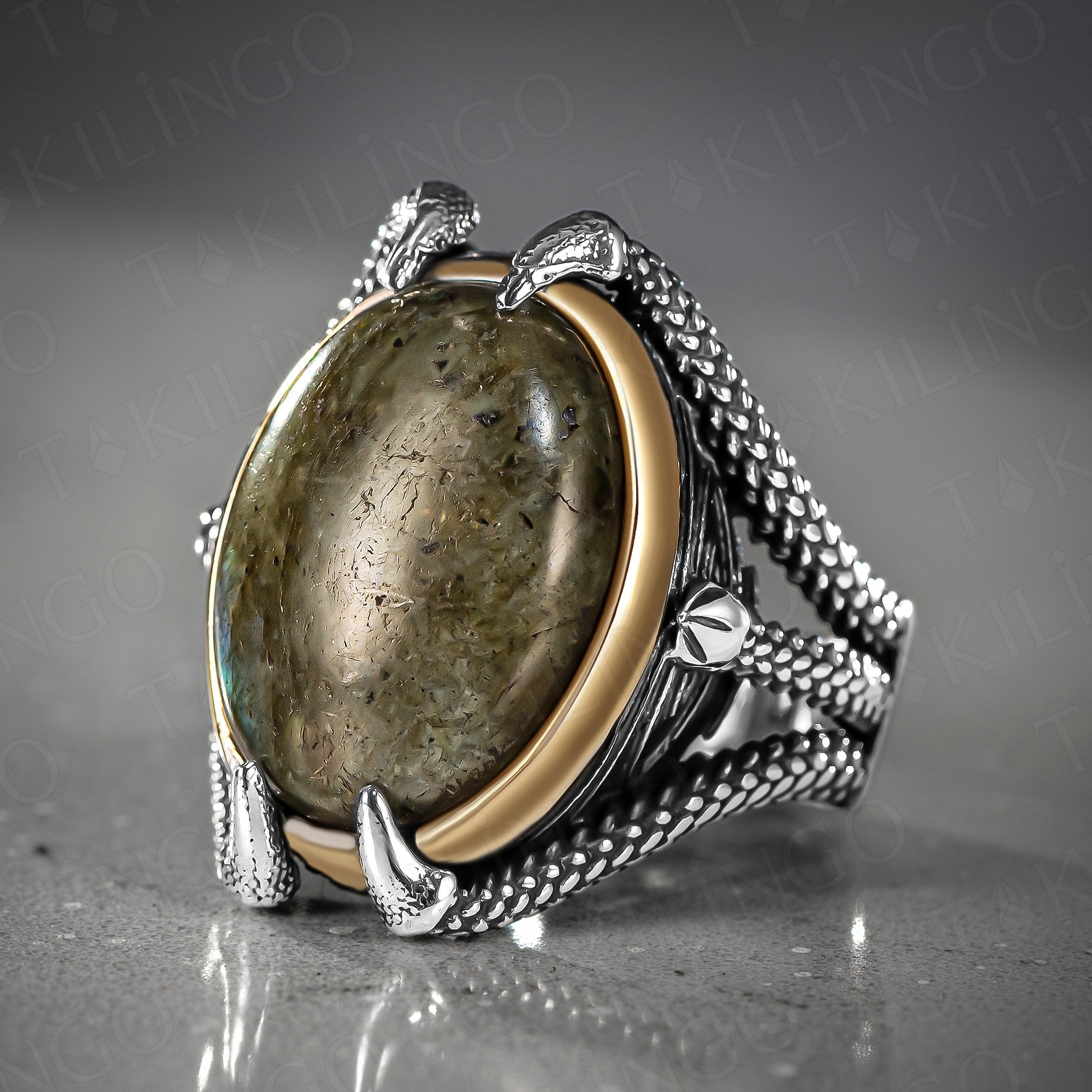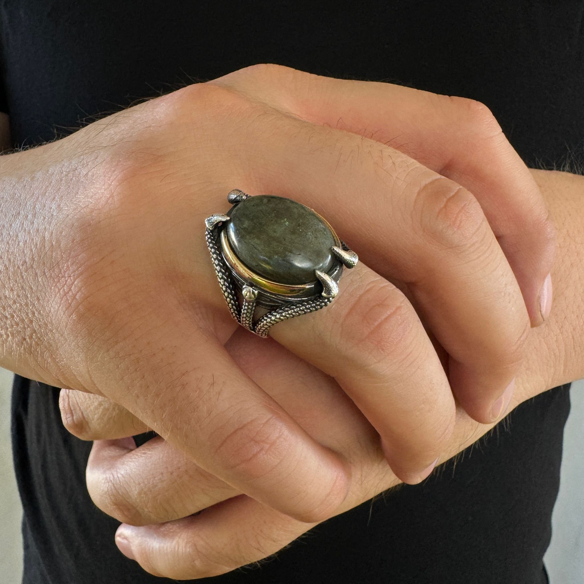 925 Ayar Gümüş Pençe Tasarımlı Labradorit Taşlı Usta İşi Erkek Yüzük
