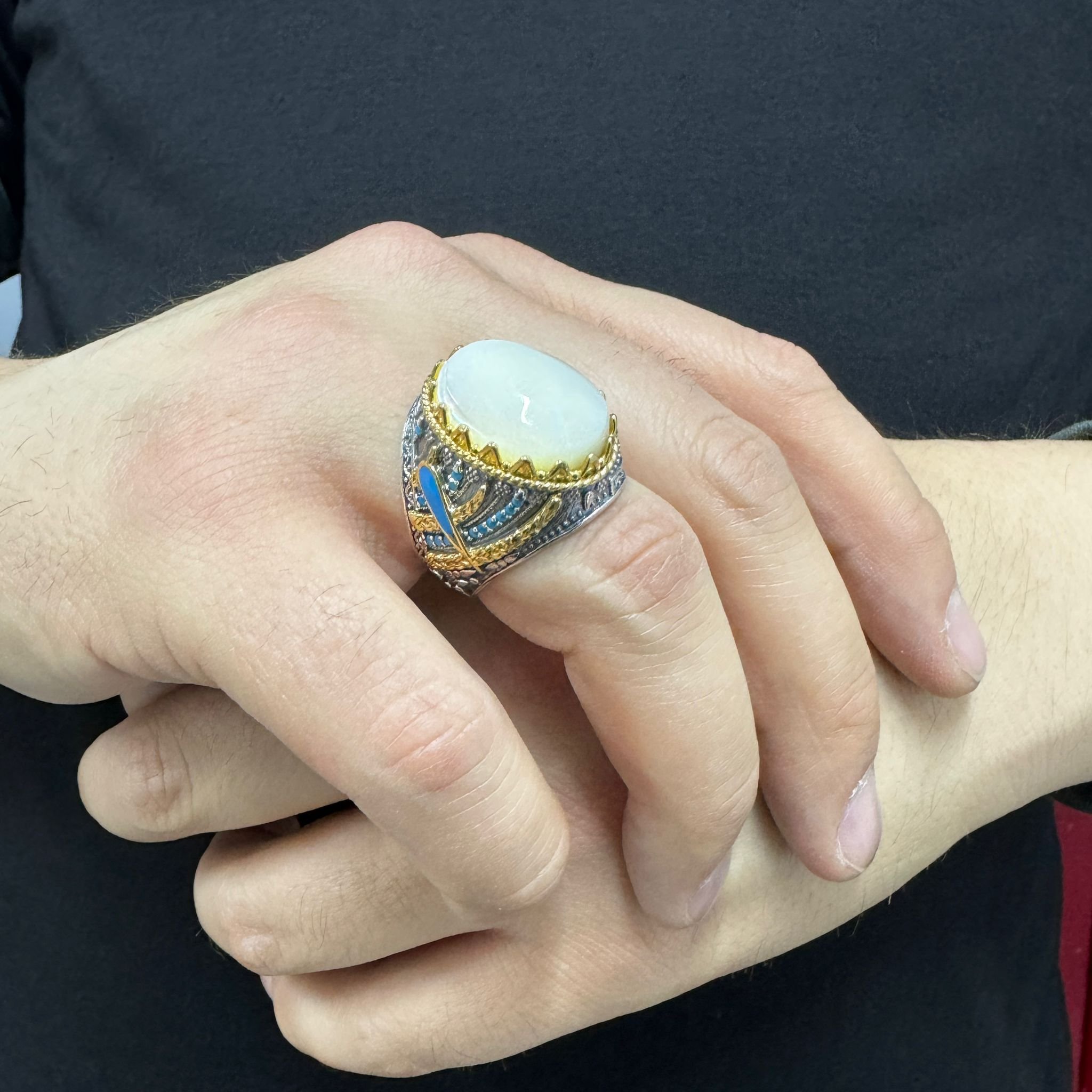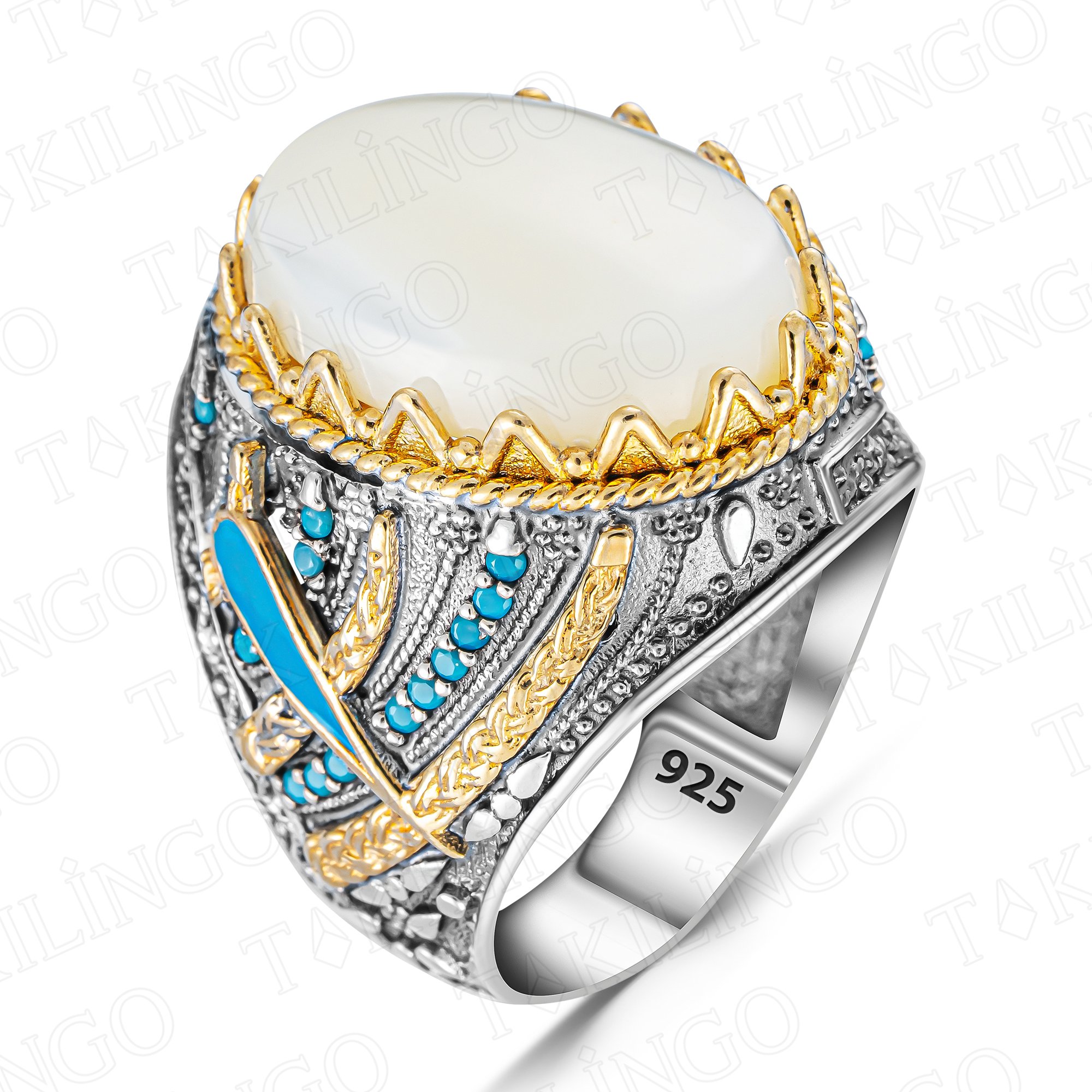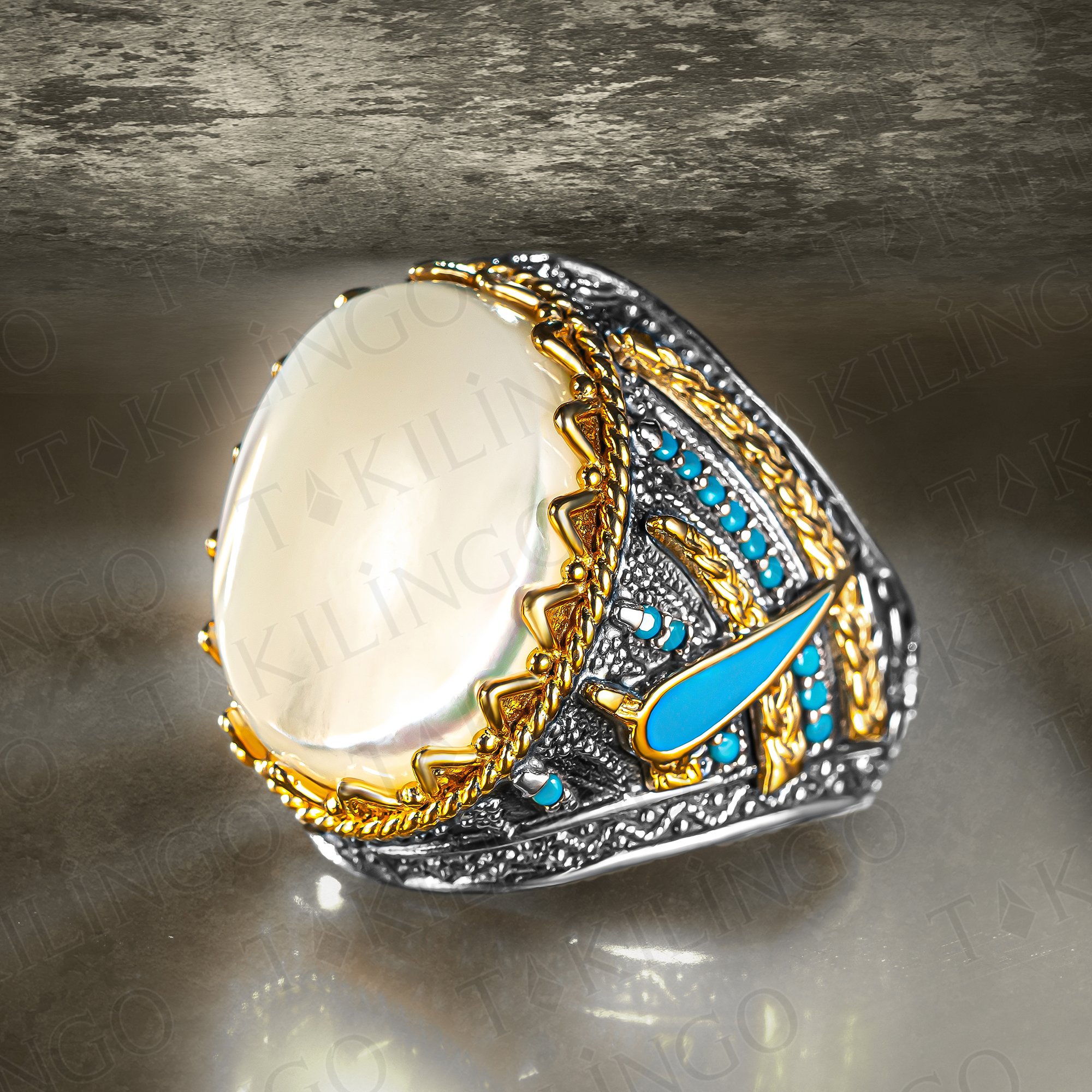 925 Ayar Gümüş Sedef Taşı İşlemeli Yanları Mini Turkuaz Taş İşlemeli Erkek Yüzük
