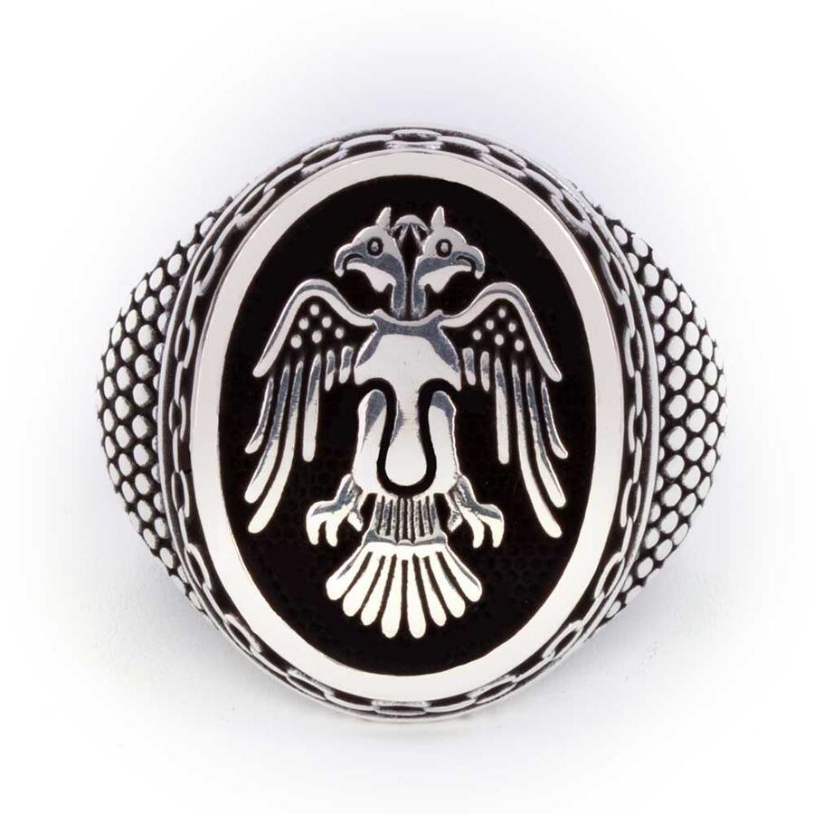 925 Ayar Gümüş Siyah Çift Kartal Başlı Zincir Motifli Simetrik Desenli Taşsız Erkek Yüzük