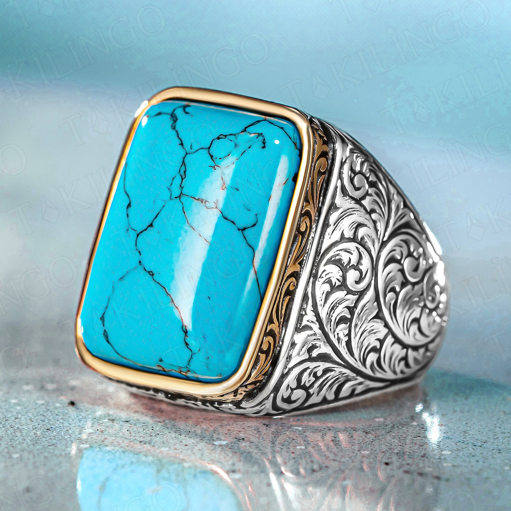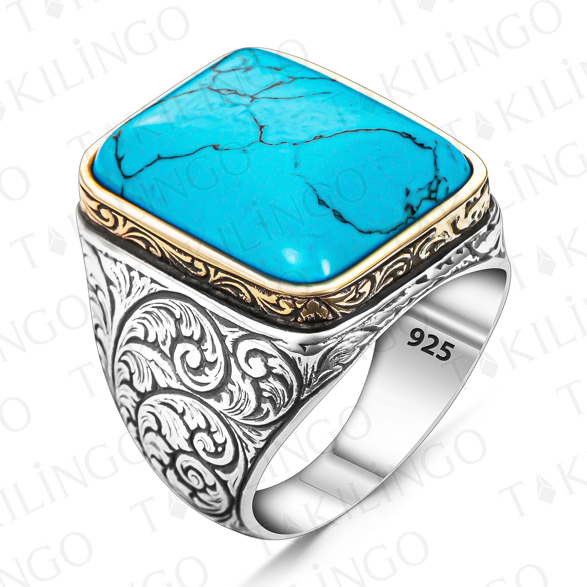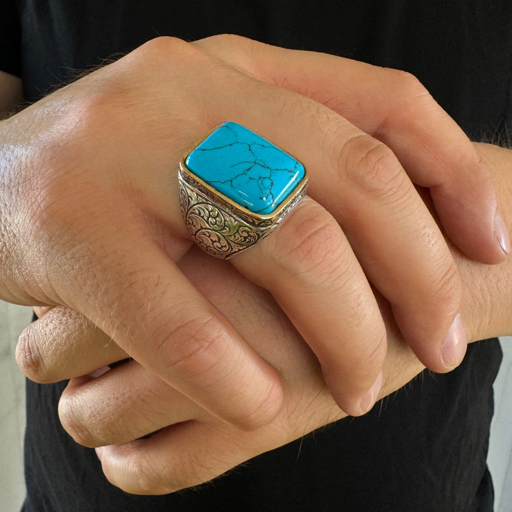 925 Ayar Gümüş Turkuaz Firuze Taşlı Kalem İşlemeli Usta İşi Erkek Yüzük