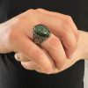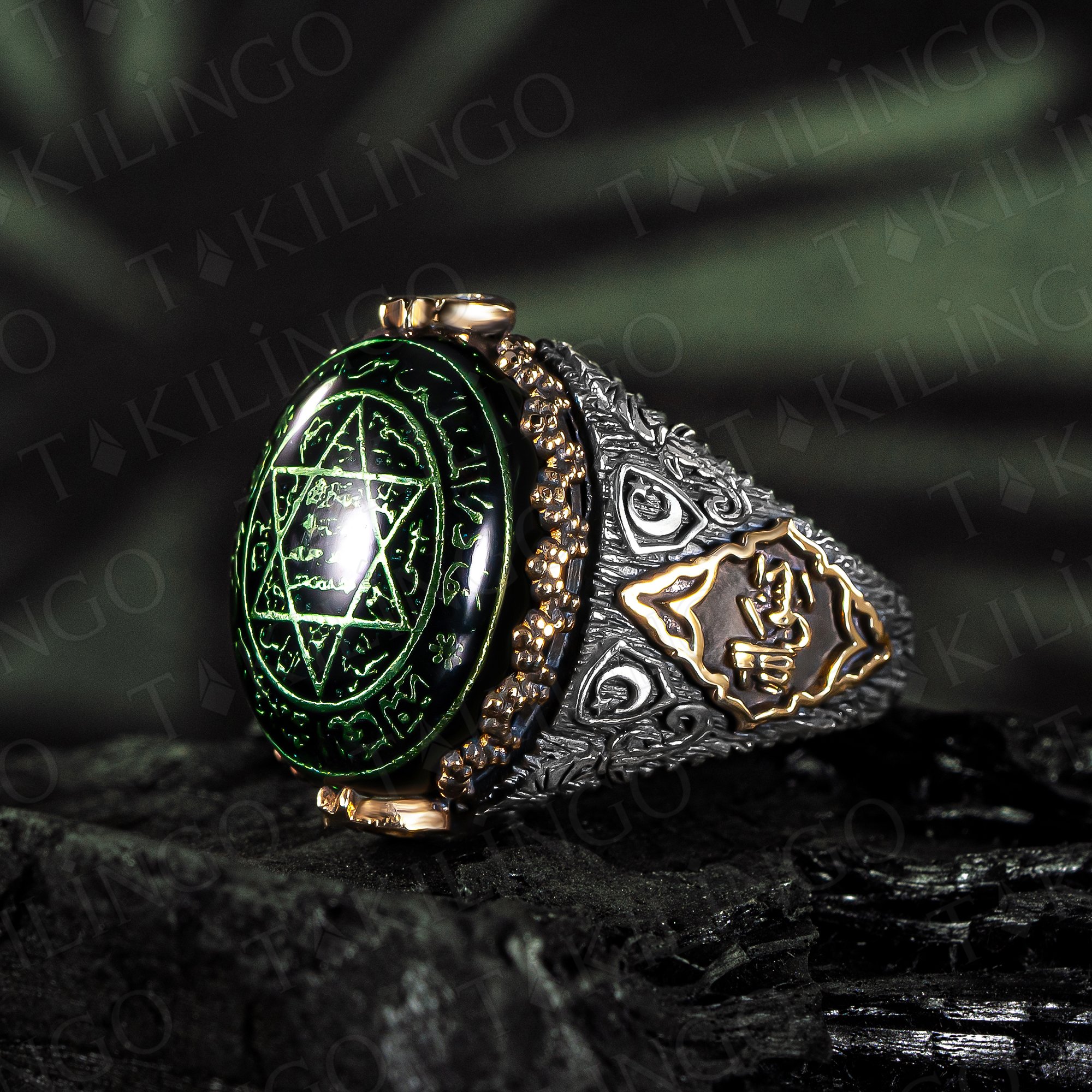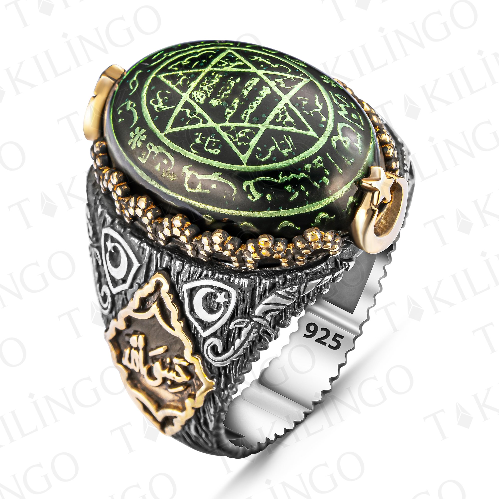 925 Ayar Gümüş Yeşil Kehribar Taşlı Mührü Süleyman Yazılı Erkek Yüzük